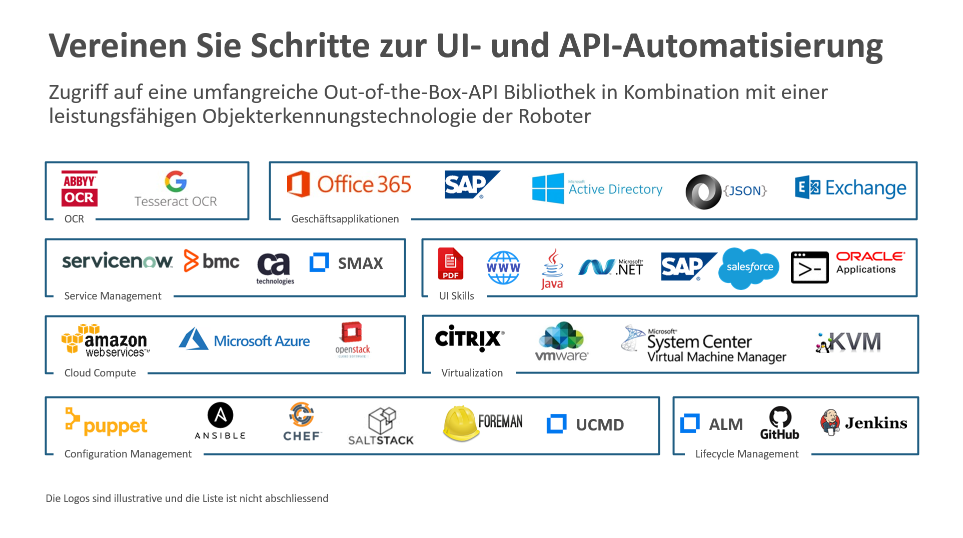 APIs und tausende von sofort einsatzfähigen Automatisierungsbausteinen (u.a. für Office 365, Service Management, DevOps, und Datenbanken) machen es einfach die RPA mit anderen Technologien für die end-to-end Automatisierung zu verbinden. Es ist zudem möglich eigene Automatisierungsbausteine zu erstellen. Weitgehende Möglichkeiten im Bereich der Orchestrierung erlauben die Erstellung von Workflows mit Logik für die Entscheidungsfindung, parallele Verarbeitung und den Umgang mit Fehlern.