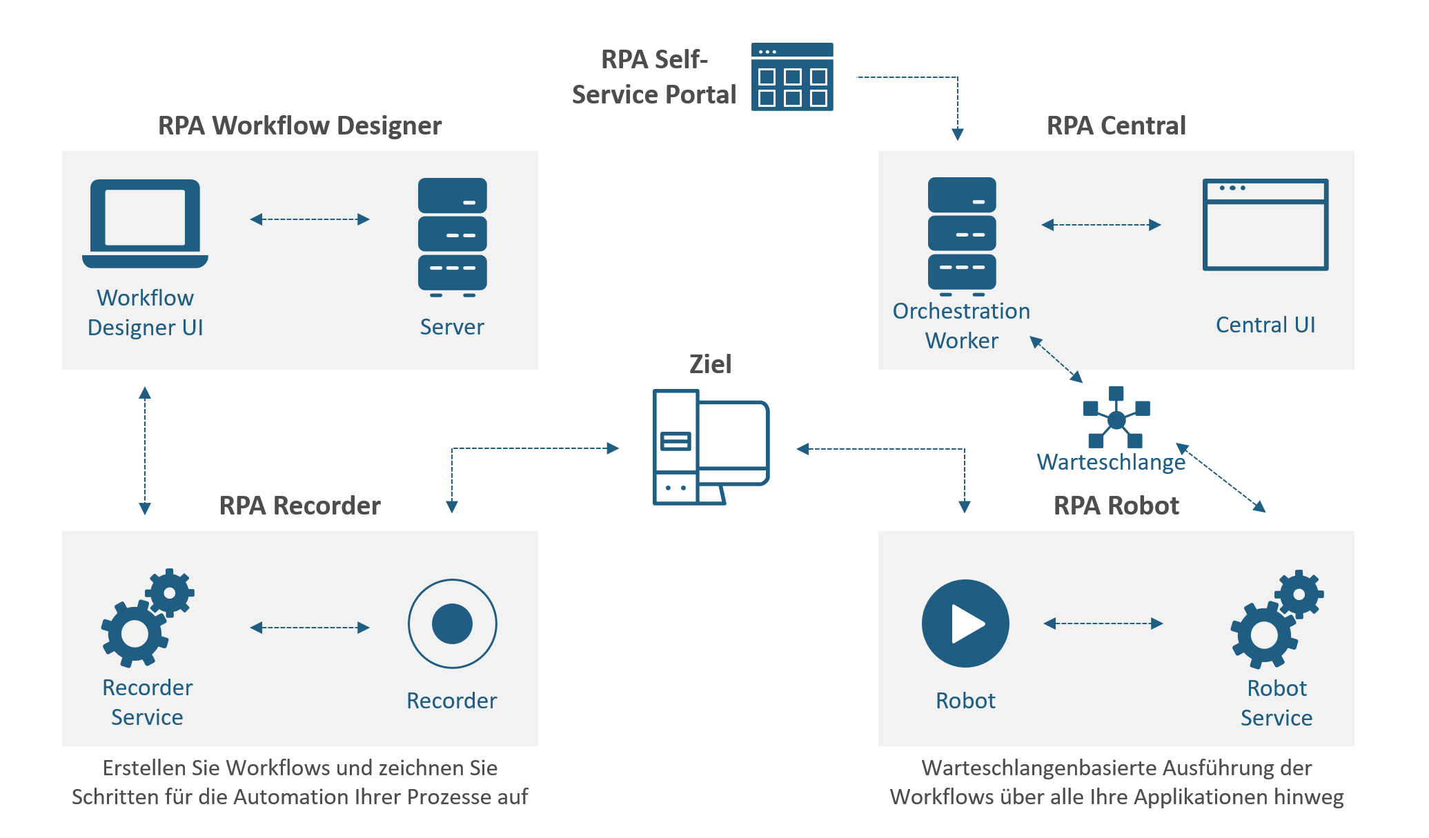 Die warteschlangenbasierte Architektur verfügt über Cluster von leistungsstarken Orchestrators, welche die Roboter verwalten und ihnen ihre Aufgaben zuweisen. Dabei ist es möglich einen Roboter für einen einzelnen seriellen Prozess bereitzustellen oder mehrere Roboter parallel arbeiten zu lassen.