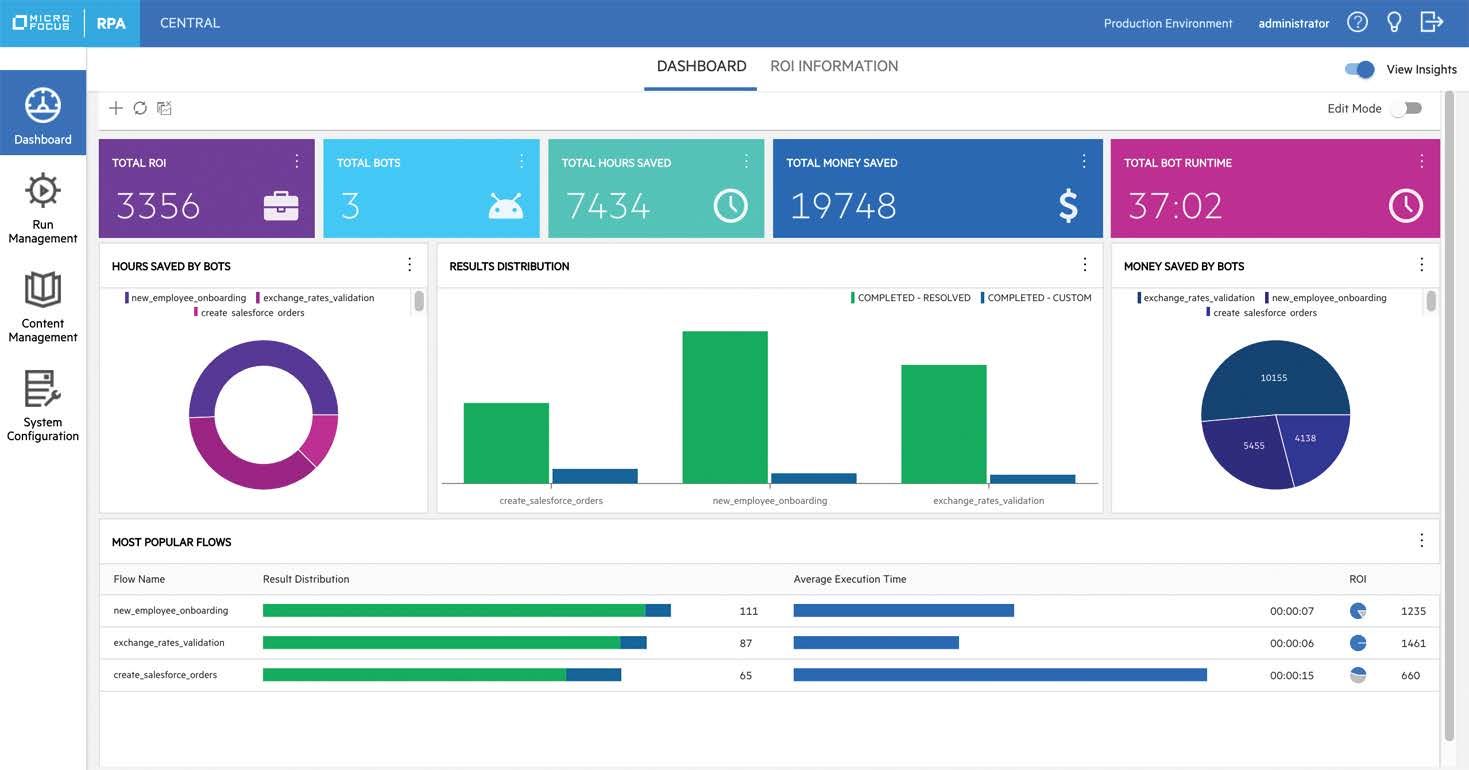 Die Roboter können von einem zentralen Dashboard aus eingeplant oder direkt gestartet und überwacht werden. Das Dashboard bietet spezifische Metriken für die Überwachung der Roboter (u.a. Kosteneinsparungen, Laufzeit der Roboter und ausgeführte Workflows). -