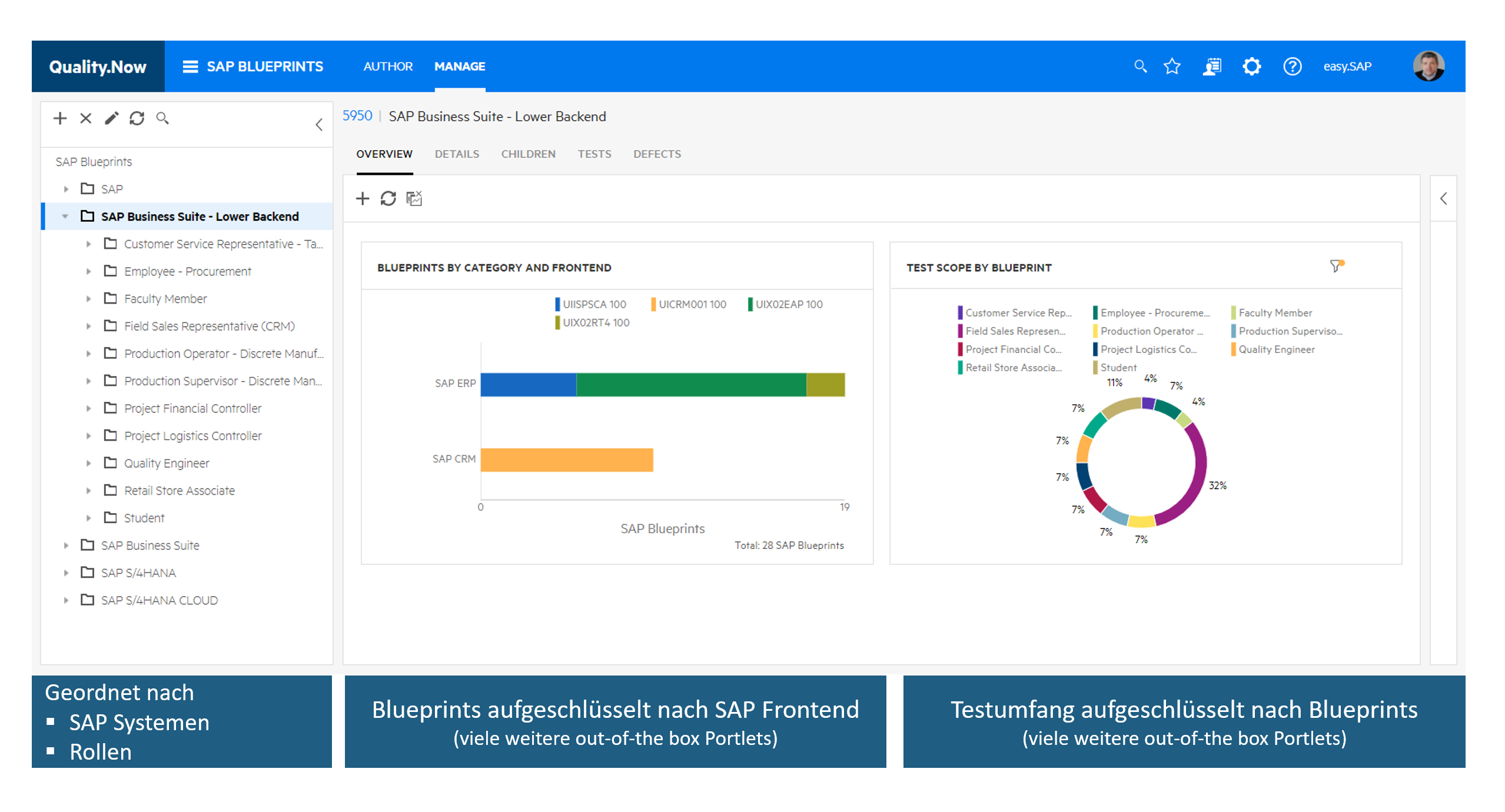 - Verfolgen Sie alle Aktivitäten zur Qualitätssicherung über all Ihre SAP Application Blueprints und SAP Functional Modules hinweg