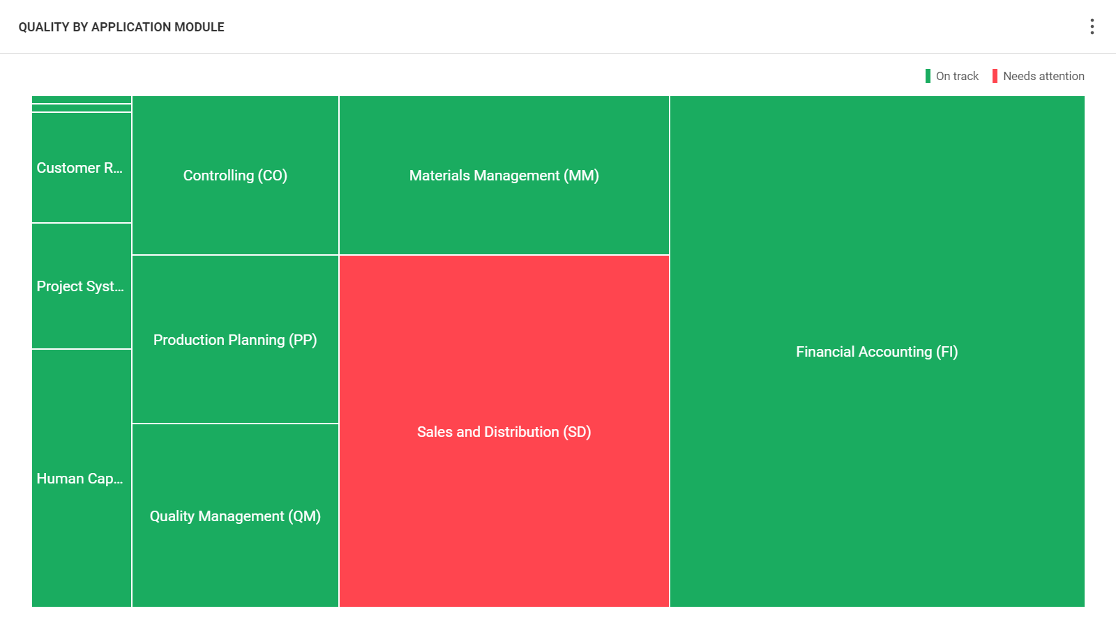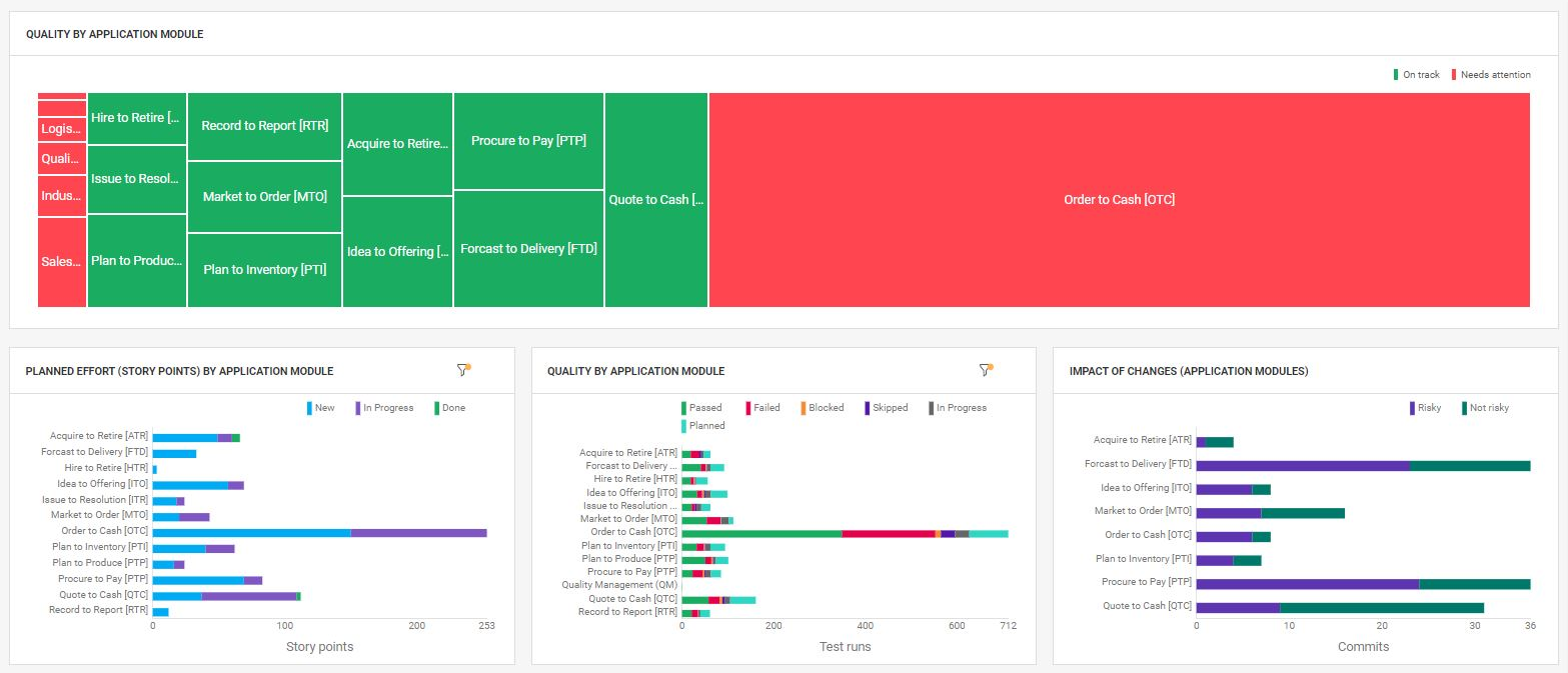 - ALM Octane bietet branchenführende Analyse- und Berichterstattungsfähigkeiten mit aussagekräftigen und sofort einsetzbaren Dashboards und Grafiken wie beispielsweise einer Heat Map zur Darstellung des Qualitätsstatus der SAP Functional Modules